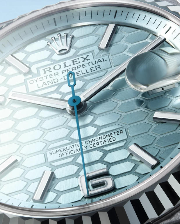 Offered in three variants—white Rolesor (combining Oystersteel and white gold), 18 carat Everose gold and 950 platinum—the best replica Rolex Land-Dweller watches is fitted with a Flat Jubilee bracelet that seamlessly extends from the case. This integrated feature was first seen in 1969 with the Rolex Quartz. The case has chamfered edges that play with your perception at all viewing angles. But it is the dial’s honeycomb motif that catches your eye. This carefully crafted dial is framed by an angled flange, whose pad-printed minute track is graduated to the half-second. The most significant highlight by far is the in-house calibre 7135, a self-winding movement with 16 patent applications. The balance wheel is crafted with optimised brass, while the balance staff uses high-tech ceramic that was sculpted by femtosecond laser.